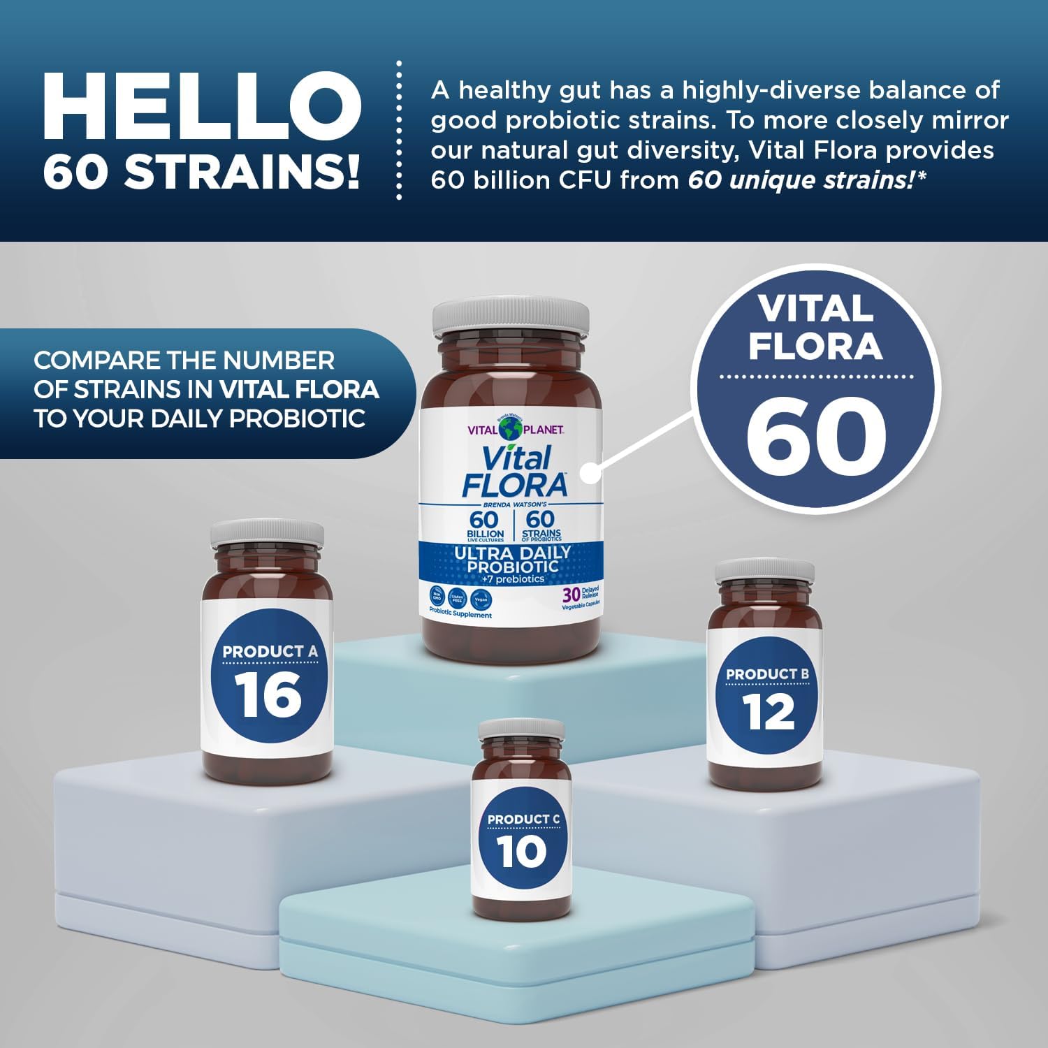 vital flora ultra daily es un probiótico de alta calidad, diseñado para responder a las necesidades digestivas e inmunitarias de hombres y mujeres. con 60 cepas de probióticos benéficos y 60 millones de cultivos vivos, además de 7 prebióticos procedentes de la agricultura biológica, este producto está formulado para reforzar el equilibrio digestivo, los problemas digestivos ocasionales y la salud inmunitaria.
